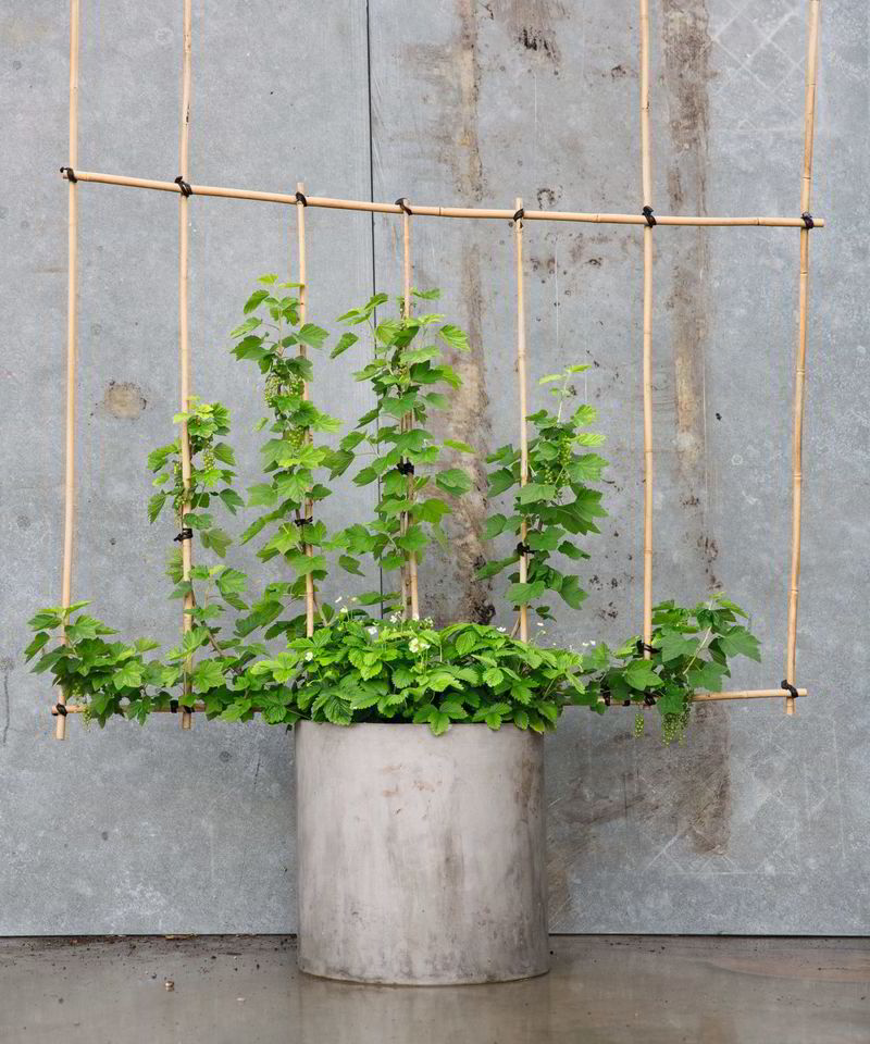 I gartnerens rike i Randesund står bærbusker og frukttrær som flatpakket inntil vegger og gjerder. I en potte står en minimalistisk ripsbusk festet til et skjelett av bambuspinner.